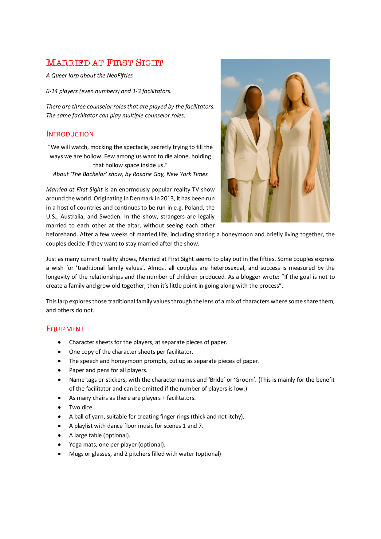 Annika and Alexis have both been active in the Nordic larp scene for more than twenty years. Together with Staffan Fladvad, they co-designed ‘Cabaret, the larp musical’. Annika has also designed a range of shorter scenarios, including ‘You want it darker’ that was run at Stockholm Scenario festival and the Smoke. Annika works at Uppsala University as professor in Human Computer Interaction and dean of Social sciences. Alexis works as youth minister in Svenska Kyrkan. Annika is the main designer of this larp, and Alexis has designed some of the characters.