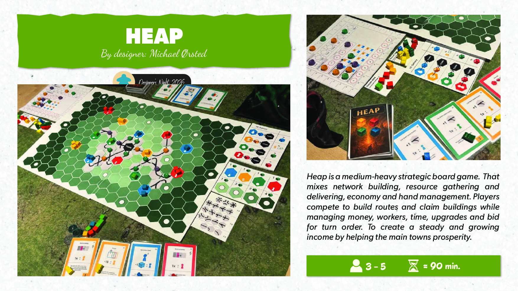 Heap is a medium-heavy strategic board game. That mixes network building, resource gathering and delivering, economy and hand management. Players compete to build routes and claim buildings while managing money, workers, time, upgrades and bid for turn order. To create a steady and growing income by helping the main towns prosperity.