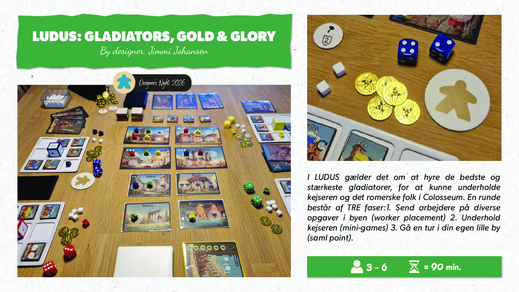I LUDUS gælder det om at hyre de bedste og stærkeste gladiatorer, for at kunne underholde kejseren og det romerske folk i Colosseum. En runde består af TRE faser:1. Send arbejdere på diverse opgaver i byen (worker placement) 2. Underhold kejseren (mini-games) 3. Gå en tur i din egen lille by (saml point).
