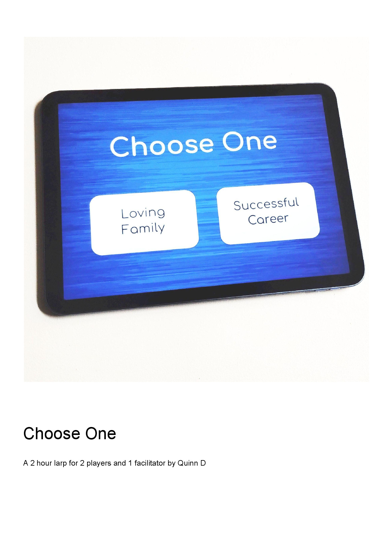 Choose One is a low transparency larp about being forced to make binary choices when we shouldn’t have to. It is about identities and how we value them.