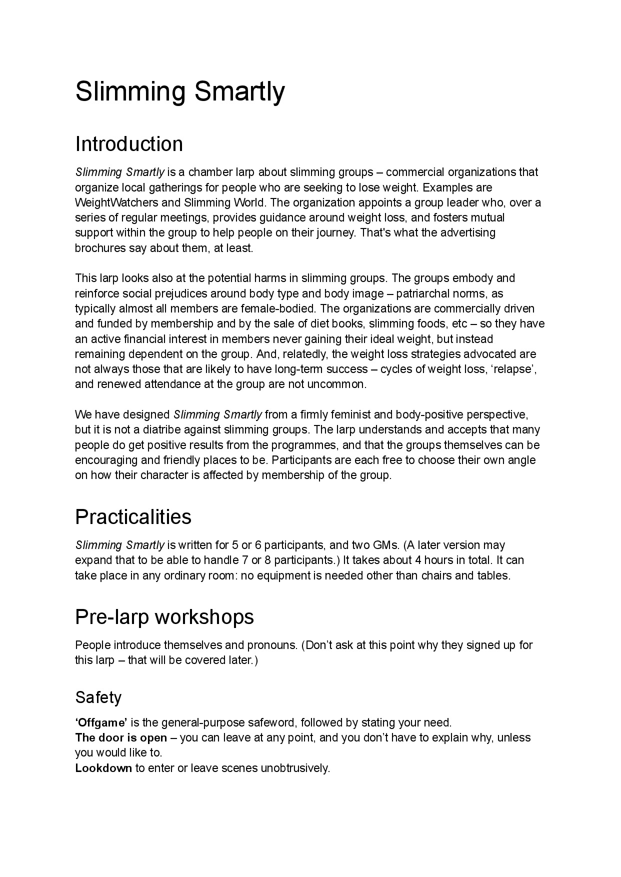 Slimming Smartly is a feminist examination of weight-loss organizations, looking critically at their operation and effects. This is an inclusive larp. The characters are all female, but all genders are welcome. It is also open to participants of all body types. We will workshop playing a character who has a different body to your own: we aim for this to be a respectful space for people who consider themselves fat, and for those who don’t.
