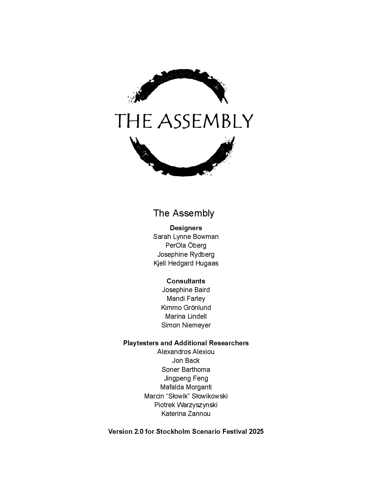 The Assembly is a larp about community members engaging in democratic deliberation about issues related to tensions between bodily autonomy and public safety. People from diverse backgrounds and political perspectives have been invited to take part in an Assembly to share their thoughts and feelings about legalizing the psychoactive substance psilocybin. At the end of the scenario, the community members will collectively construct guidelines that will be considered at the next parliamentary session.