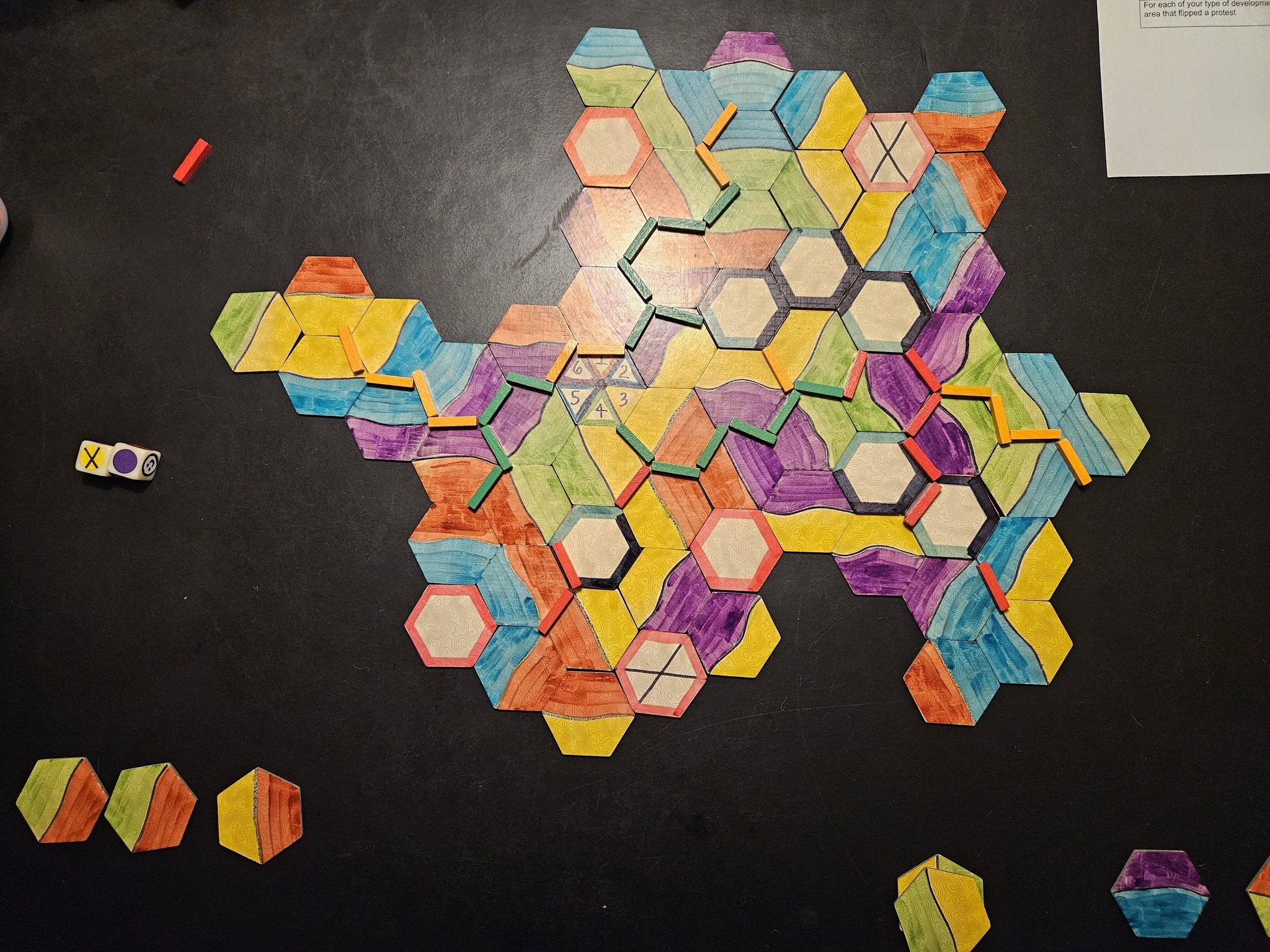 A puzzly tile laying game where you and a fellow city planner compete to design a sustainable city connected by a 20-segment bike path (each representing 1 minute). As you build, the City Council keeps vetoing your plans, Protestors (think car lobbyists, climate change deniers) block projects, as your rival planner sneakily tries to dominate the city plan.
