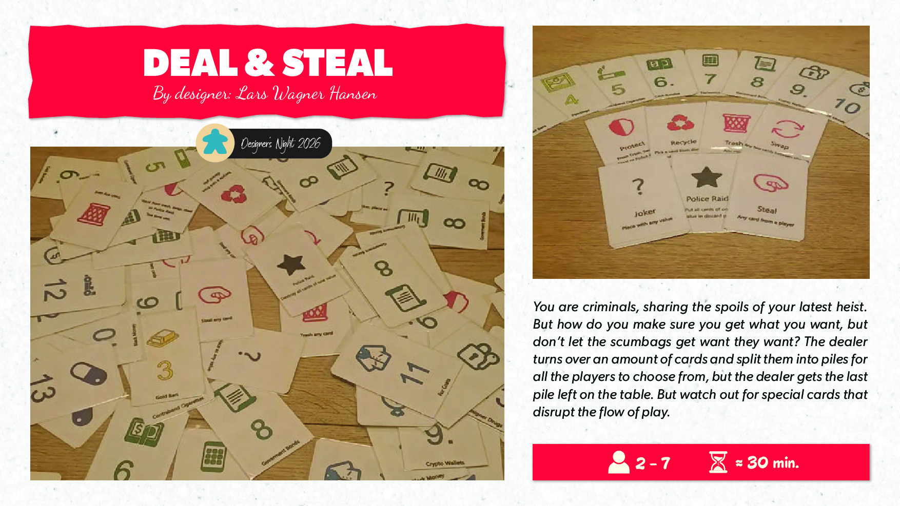 You are criminals, sharing the spoils of your latest heist. But how do you make sure you get what you want, but don’t let the scumbags get want they want? The dealer turns over an amount of cards and split them into piles for all the players to choose from, but the dealer gets the last pile left on the table. But watch out for special cards that disrupt the flow of play